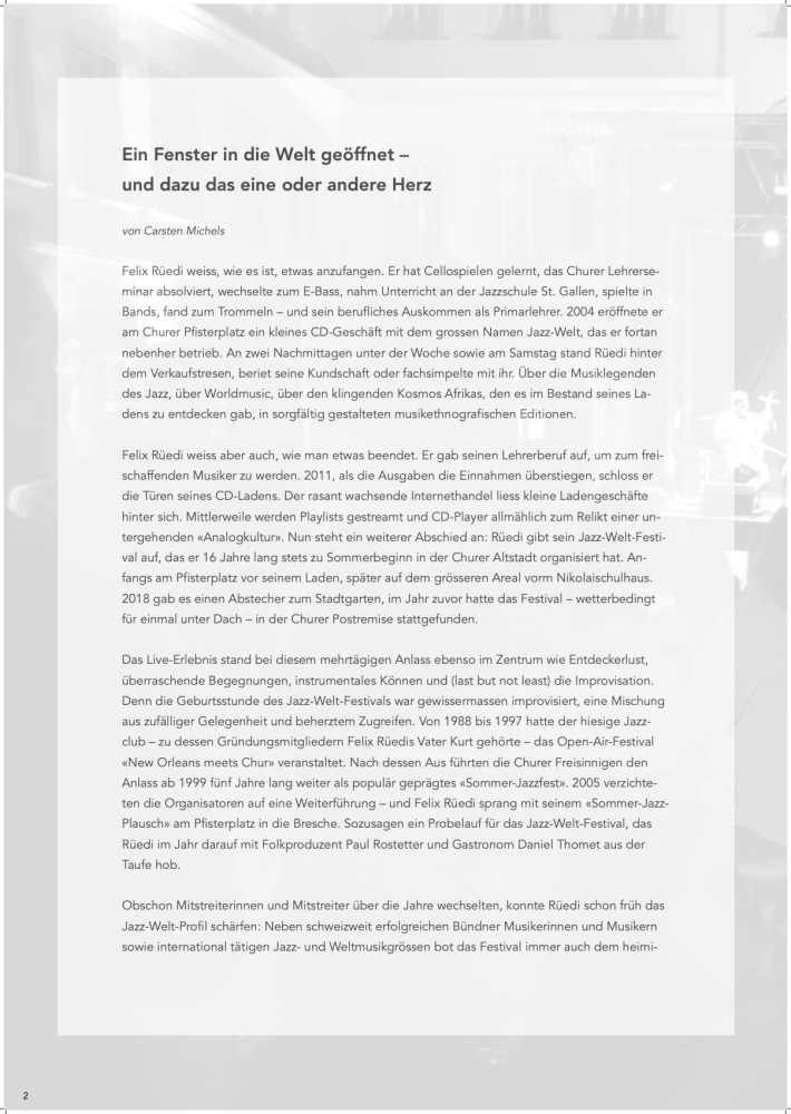 Für alle, die sich gerne an dieses Projekt erinnern, hat Felix Rüedi eine Chronik mit Programmen, Pressebeiträgen, Fotos und Informationen verfasst.